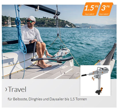 Mit seiner integrierten Lithium Batterie und seiner überragenden Effizienz ist der Travel die Alternative zum kleinen Benzin-Außenborder. Der Travel kann alles was ein 3 PS Außenborder kann. Ist aber leichter, sauberer, leiser und komfortabler.